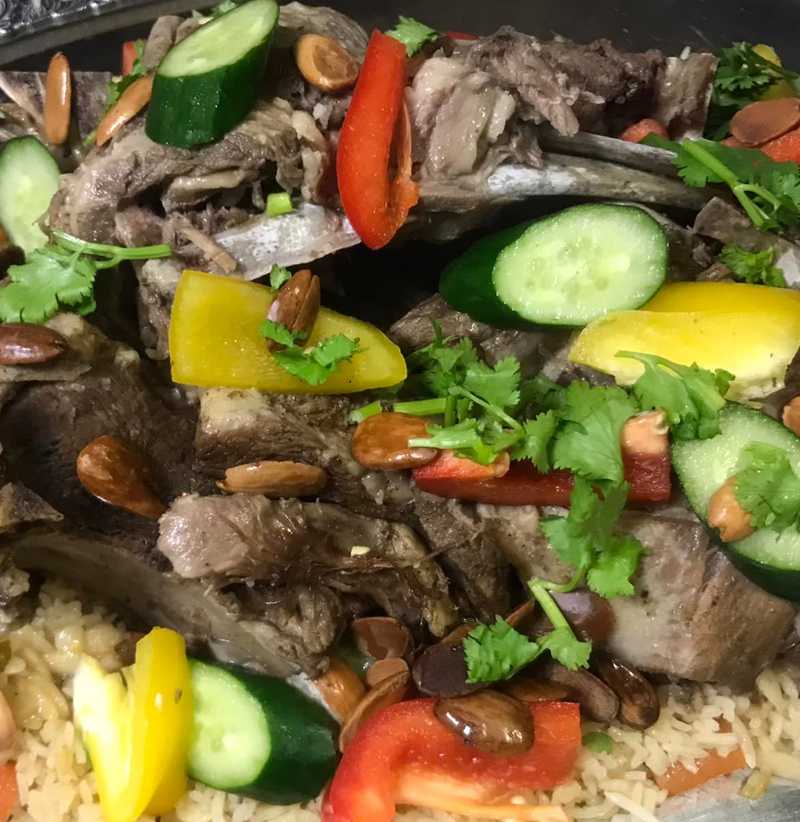 肉を“ジャミード”と呼ばれる乾燥ヨーグルトで煮込み、お皿に炊いたお米とナッツ類を盛り付けた上に肉を置いて、上から煮汁を掛けて提供されます。