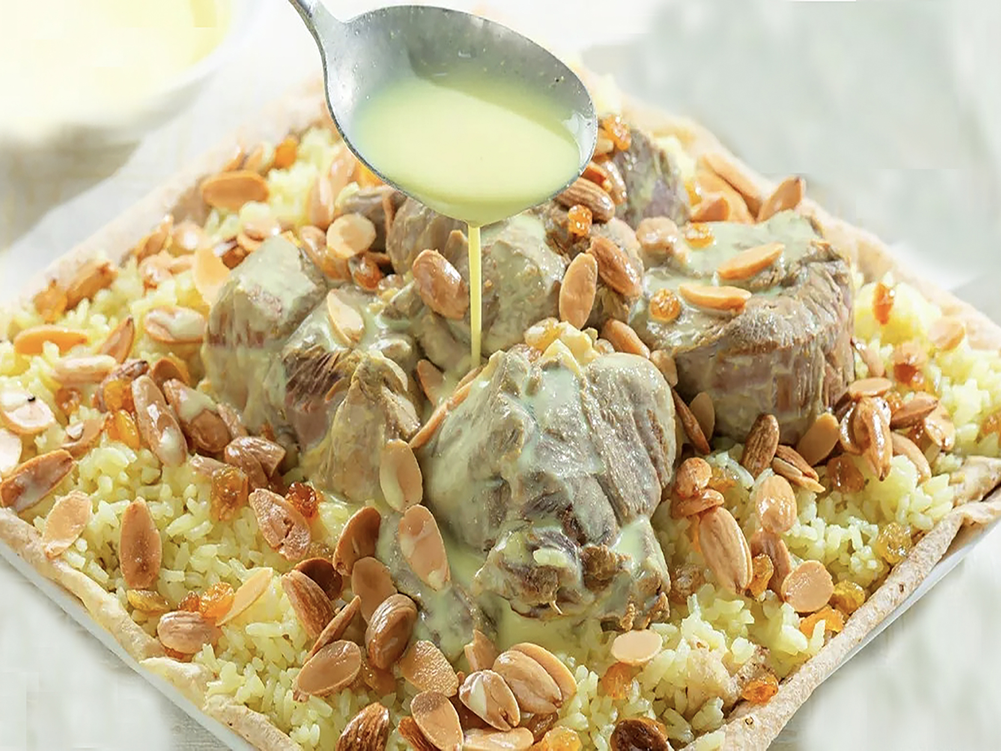 提供方法: 大皿に炊いた米や薄焼きパンを敷き、その上に調理した肉を乗せ、上からジャミードのソースをかけます。